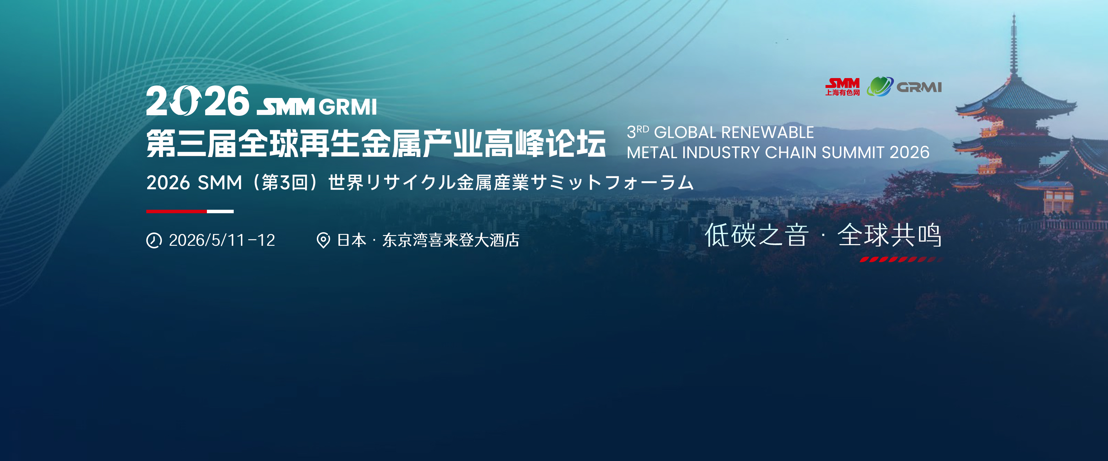 值此国际背景下,2026SMM(第三届)全球再生金属产业链高峰论坛将于2026年5月11-12日在日本东京召开,峰会旨在汇聚全球再生金属领域的顶尖企业、科研机构、行业专家与政策制定者,以“低碳之音,全球共鸣”的会议主题,共同探讨再生金属行业发展的新趋势、新技术、新政策,搭建一个交流合作、资源共享、协同创新的国际化平台,助力全球资源循环利用体系的构建与完善,为实现全球绿色经济转型贡献力量。